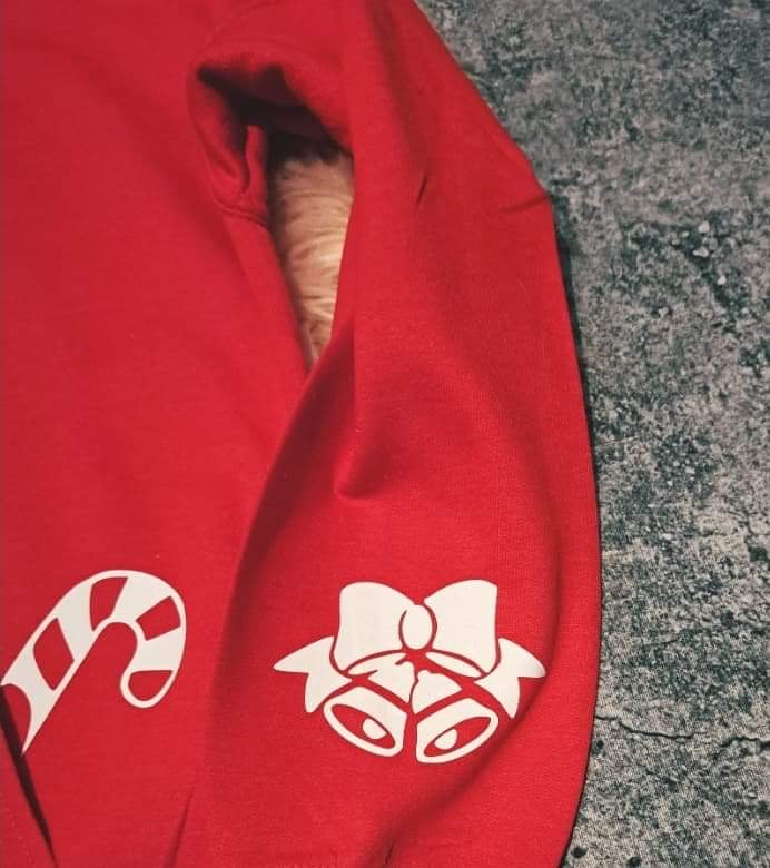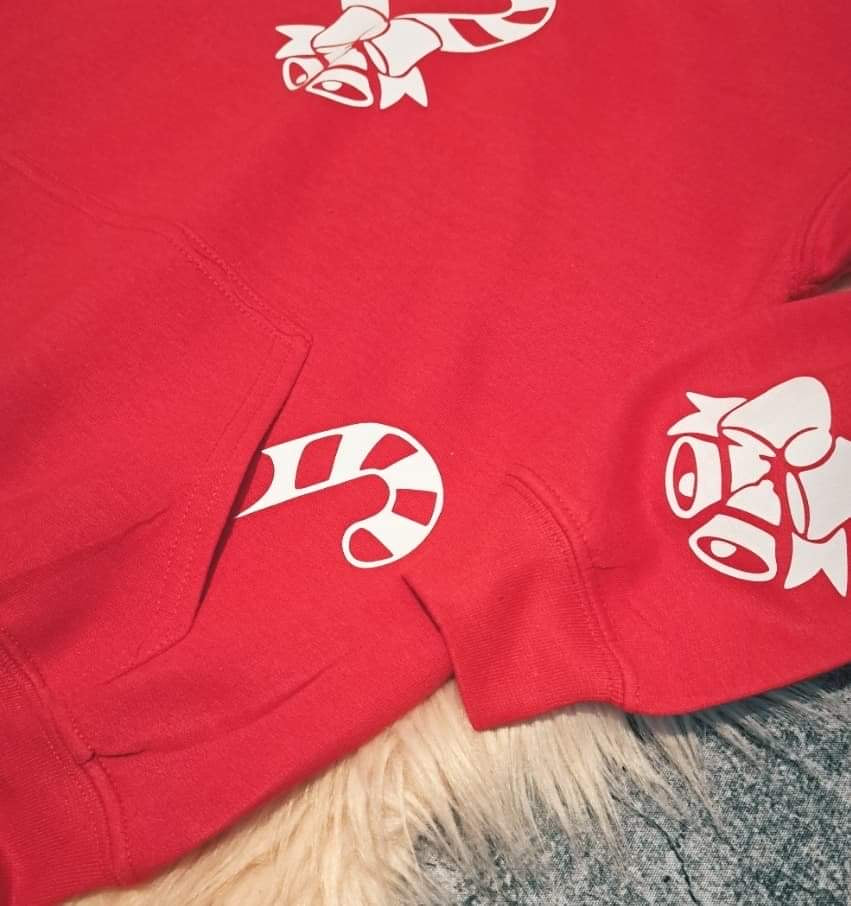 Red hoodie printed with candy canes and bws on the sleeves, front chest and inner pockets